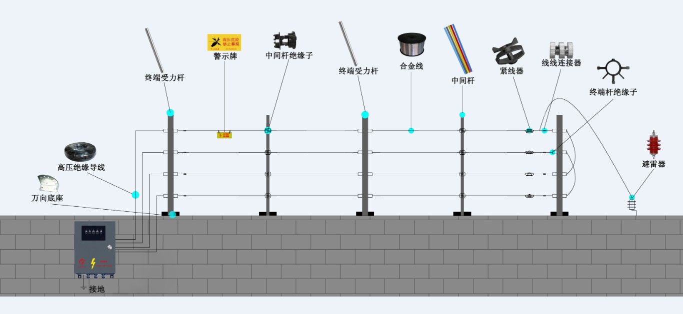2、電子圍欄的安裝按其在現場的安裝位置,分為獨立式,附屬式和墻頂式三種基本安裝形式。
